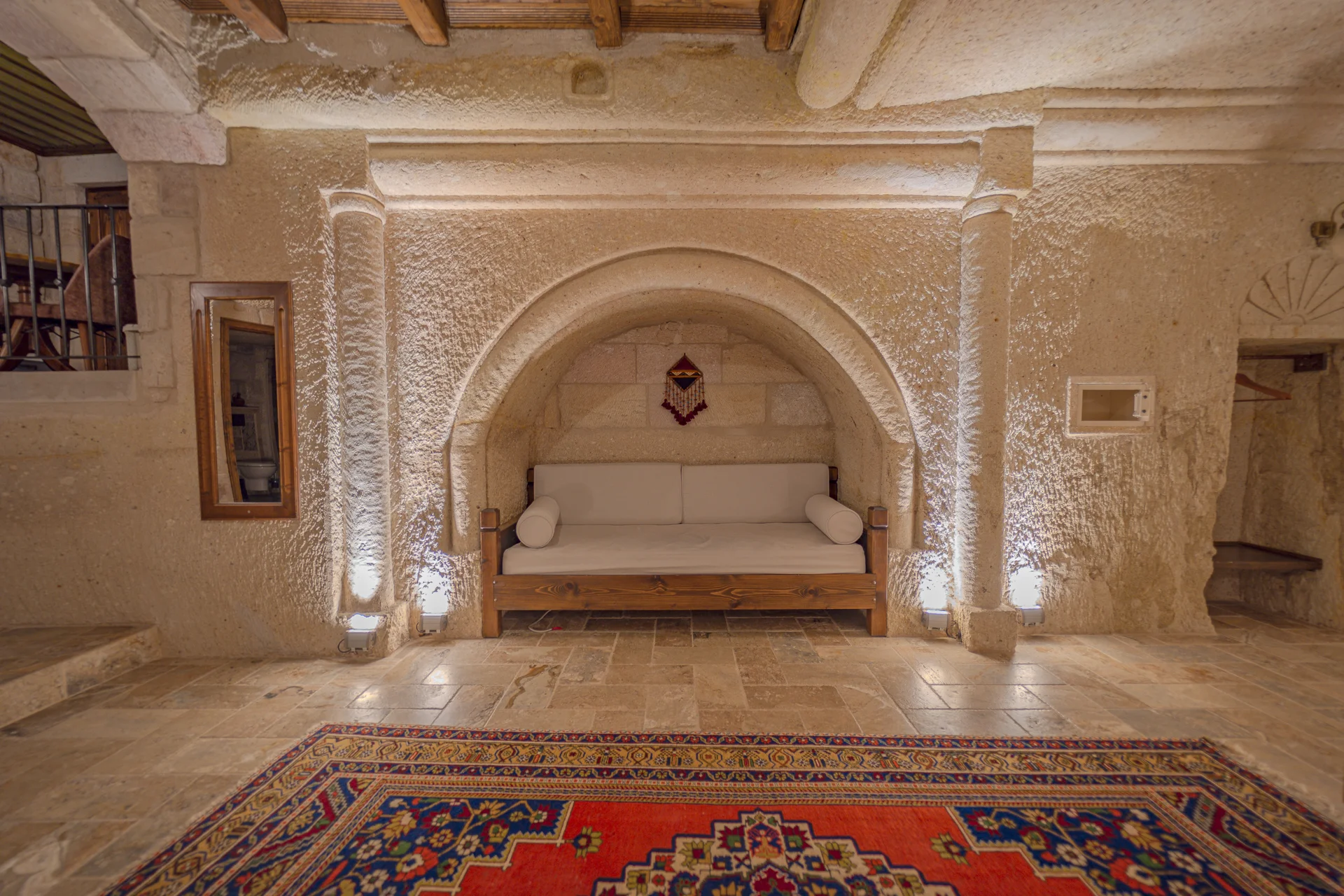 The room is equipped with an underfloor heating system for perfect comfort during your stay. With a spacious 40 m² layout and a king-size bed, this cave room can accommodate 4 guests in luxury and is perfect for couples seeking an unforgettable cave hotel experience in Cappadocia.