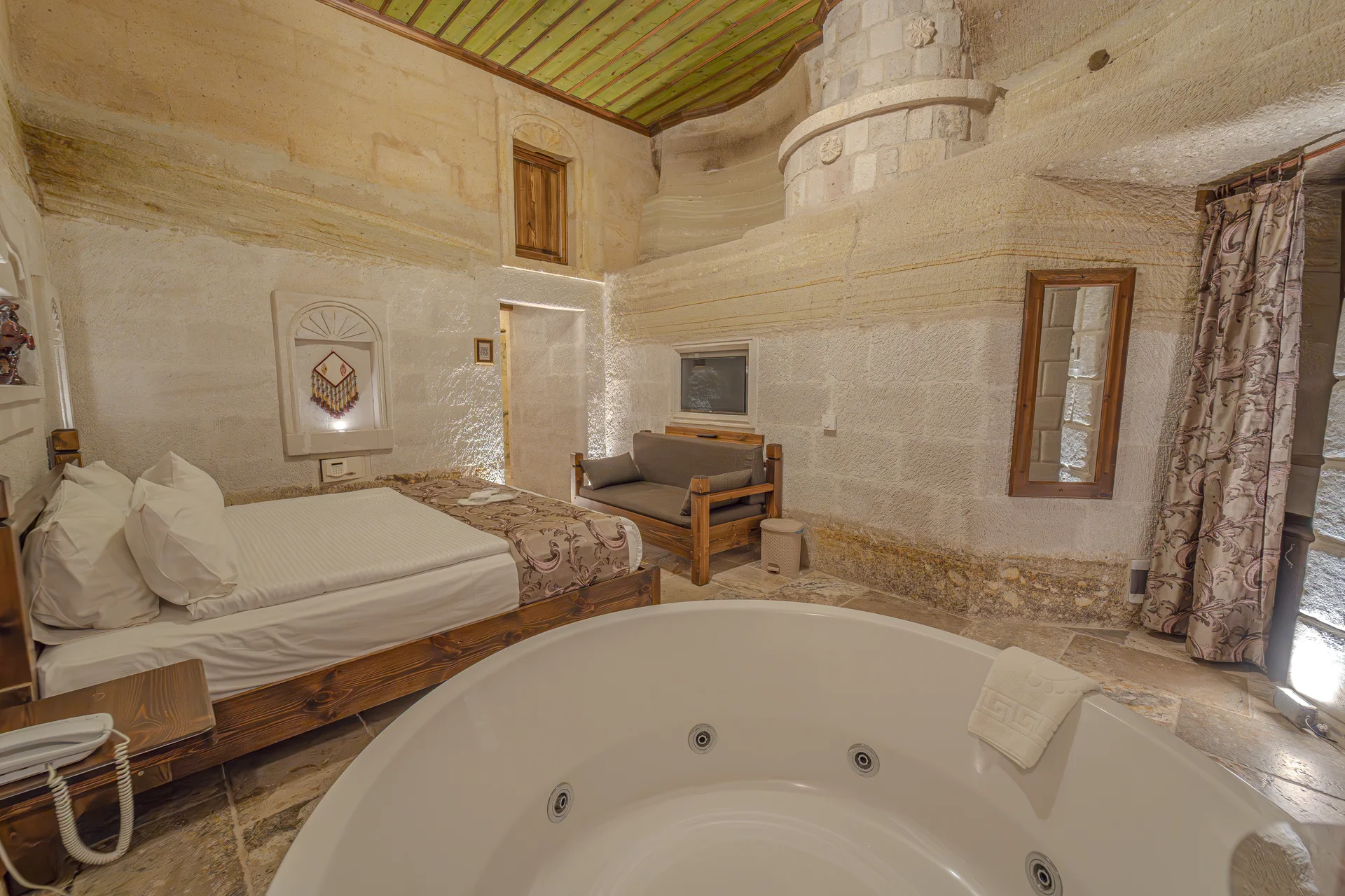 Located in the heart of Cappadocia, Göreme, our cave room with jacuzzi features a luxurious design carved into natural rock formations. This premium cave accommodation combines traditional Cappadocian architecture with a jacuzzi, offering guests a romantic and relaxing experience.