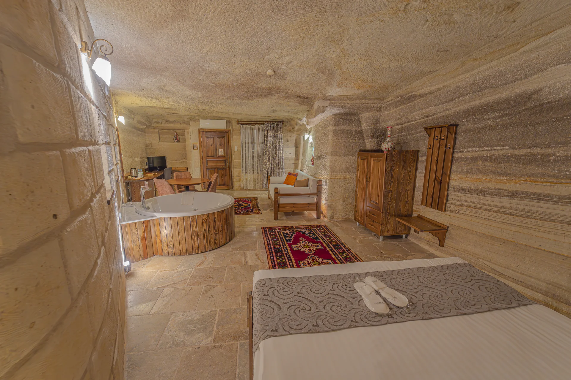 Located in the heart of Cappadocia, Göreme, our king cave room with jacuzzi features a magnificent design carved into ancient rock formations. This luxurious cave accommodation combines traditional Cappadocian architecture with a king-size bed and jacuzzi, offering guests a royal-level romantic experience.