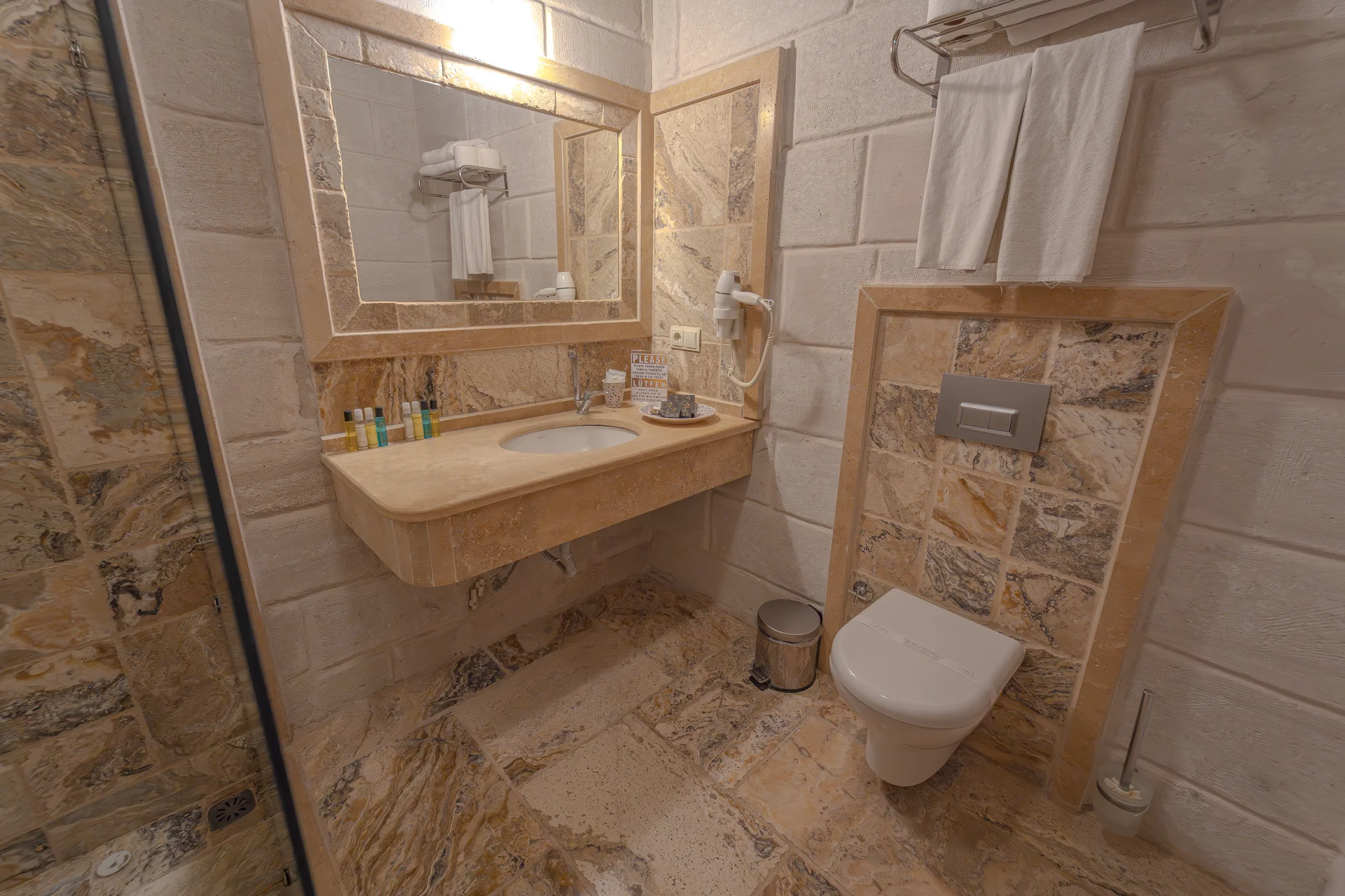 The room is equipped with an underfloor heating system for optimal comfort during your stay. With a 25 m² layout, this superior cave room can comfortably accommodate 3 guests and is perfect for couples or small families seeking a comfortable cave hotel experience in Cappadocia.