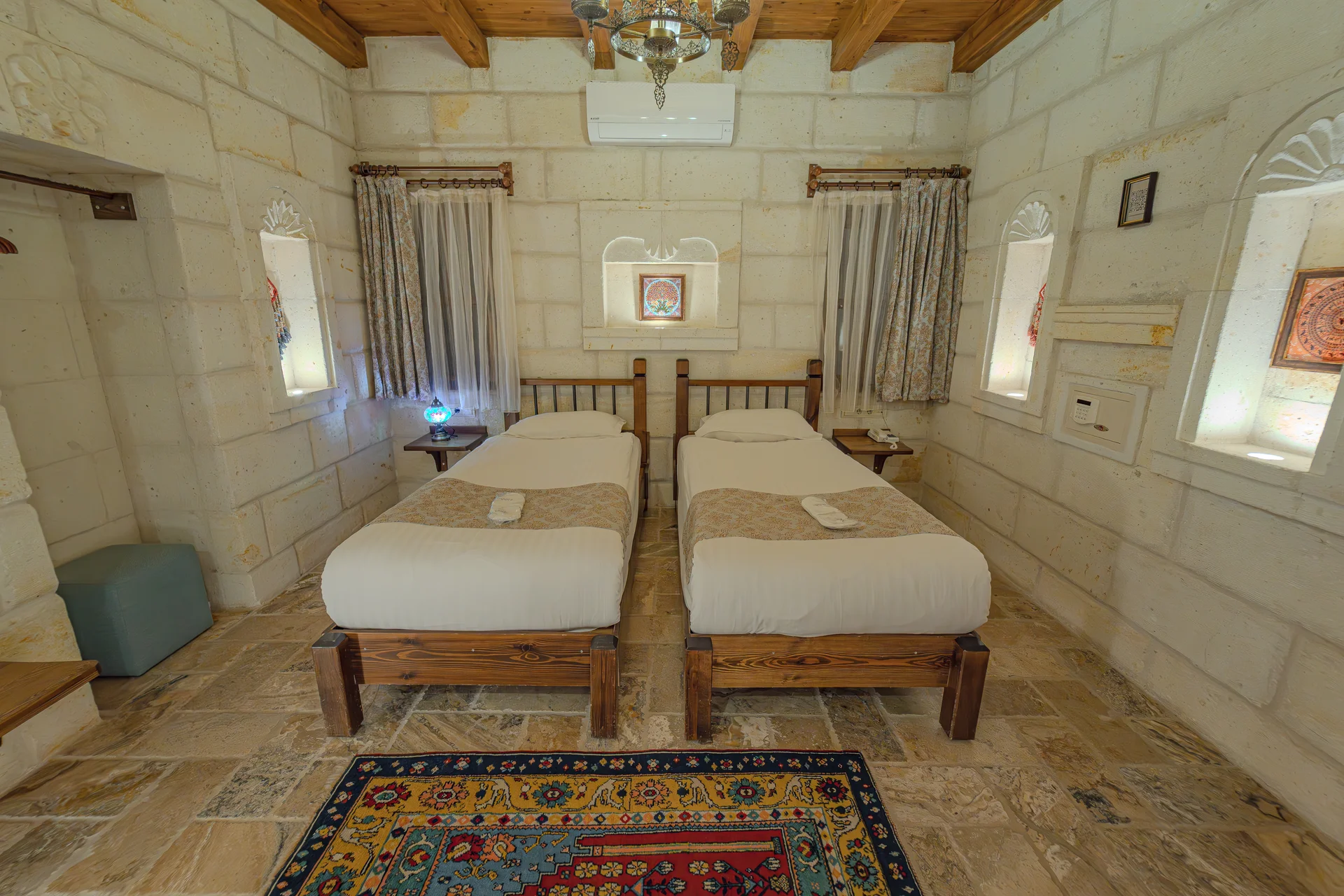 Kapadokya'da, Göreme'de bulunan bu ikiz yataklı taş oda, bölgeye özgü taşlarla inşa edilmiş olup pratik tasarımı ile dikkat çekmektedir. Bu fonksiyonel konaklaması, geleneksel Kapadokya mimarisini modern konforla birleştirerek misafirlere rahat bir taş oda deneyimi sunar.