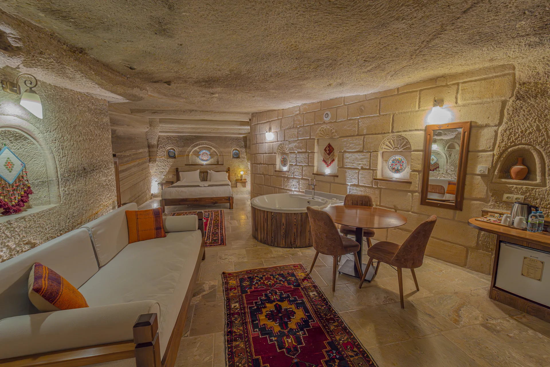 The room is equipped with an underfloor heating system for supreme comfort during your stay. With a spacious 38 m² layout, a king-size bed, and a private jacuzzi, this cave room can accommodate 3 guests in luxury and is perfect for couples seeking an unforgettable romantic cave hotel experience in Cappadocia.