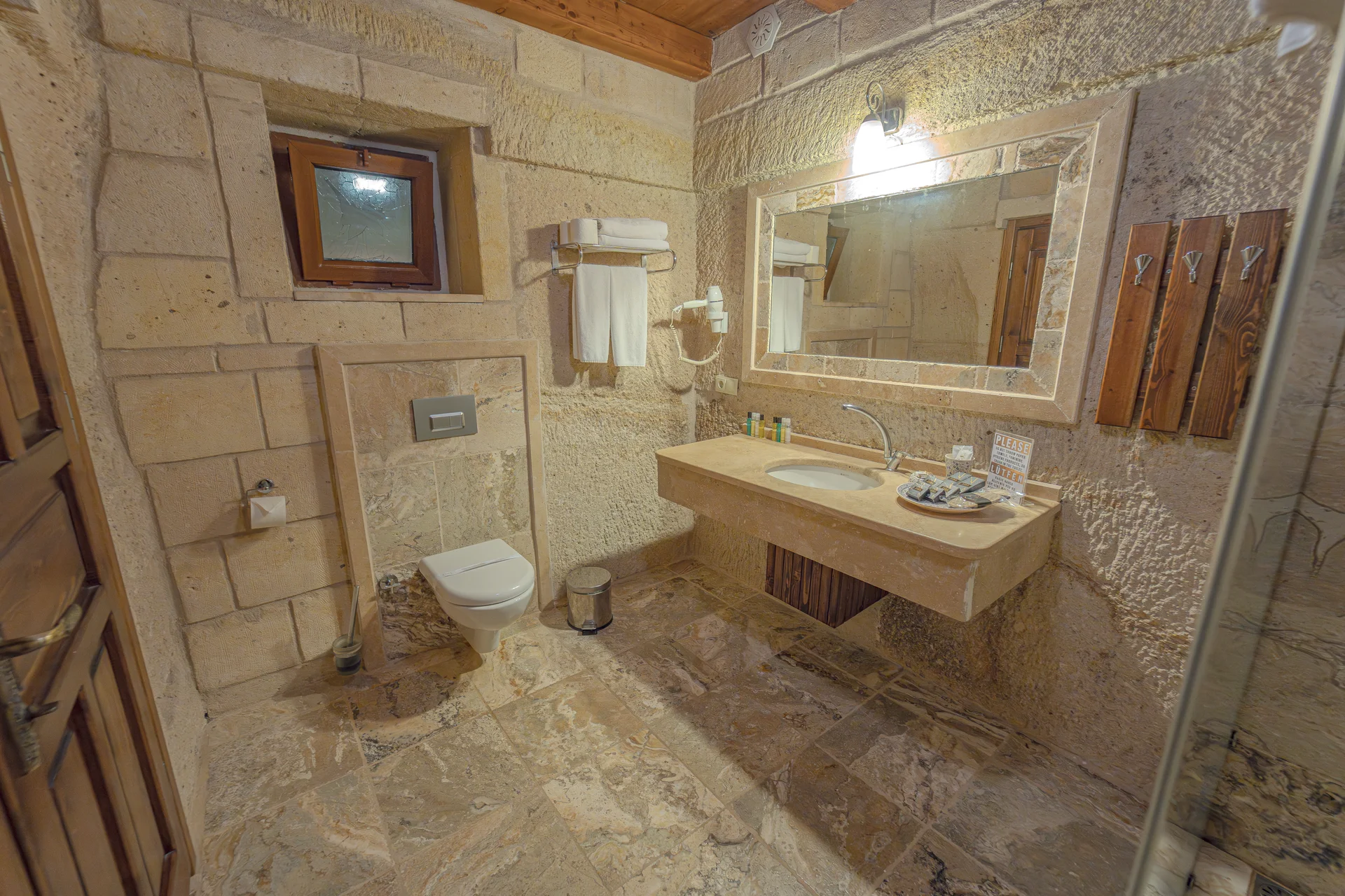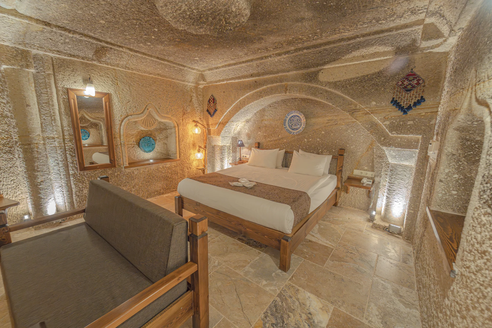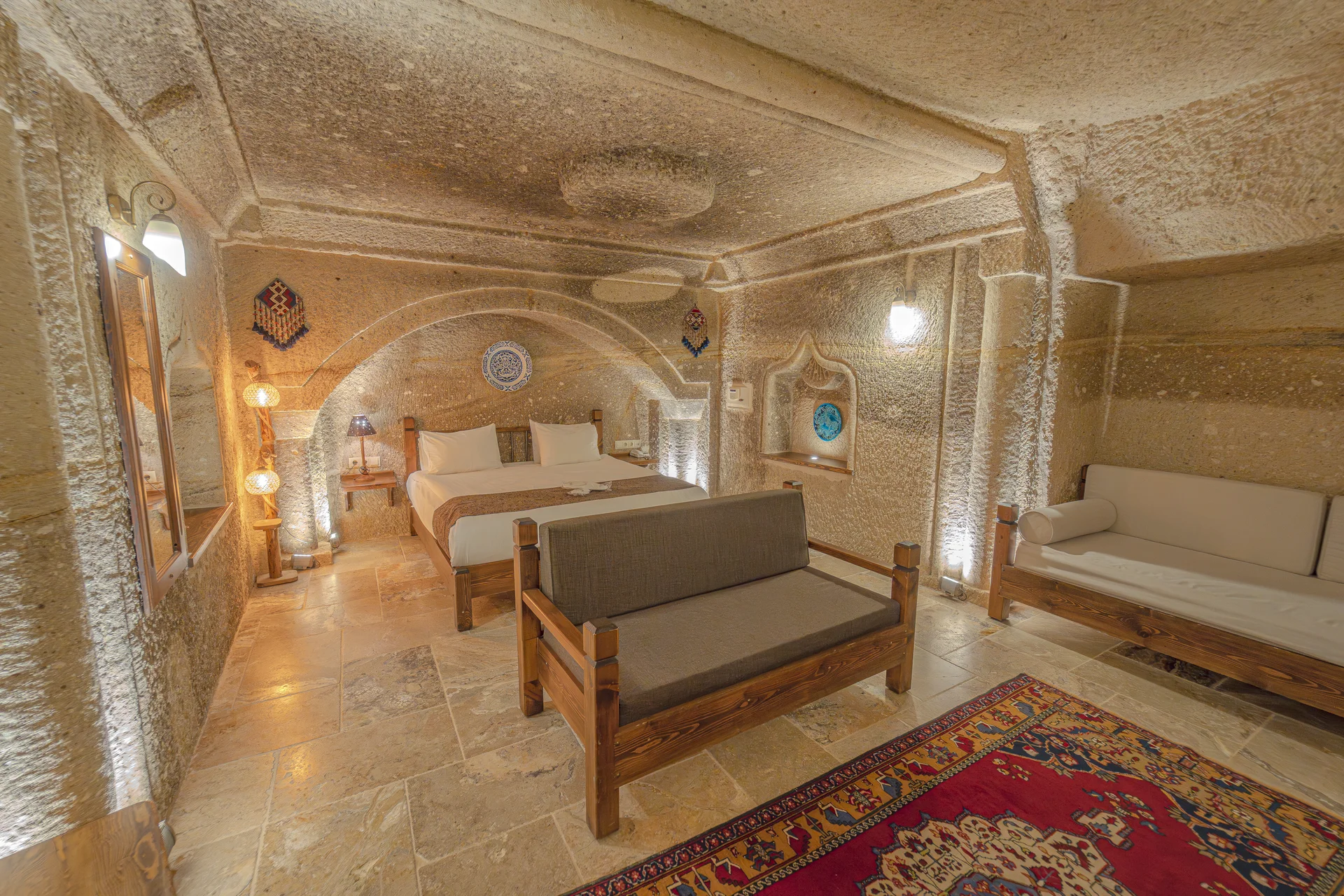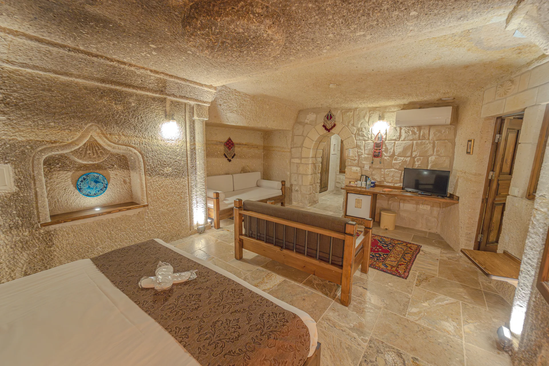 La habitación está equipada con un sistema de calefacción por suelo radiante que garantiza un confort óptimo durante toda su estancia. Con un diseño espacioso de 30 m², esta habitación cueva superior puede alojar cómodamente hasta 3 huéspedes, lo que la hace perfecta para parejas o pequeñas familias que buscan una experiencia inolvidable en un hotel cueva en el mágico paisaje de Capadocia.